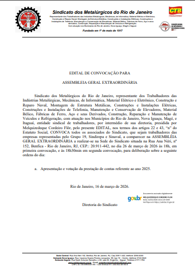 Sindimetal-Rio convoca os metalúrgicos para a assembleia geral extraordinária, que acontecerá no dia 26 de março, às 18h, em primeira chamada, ou 18h30 em segunda e última chamada, quando será votada a prestação de contas referente ao ano de 2025.