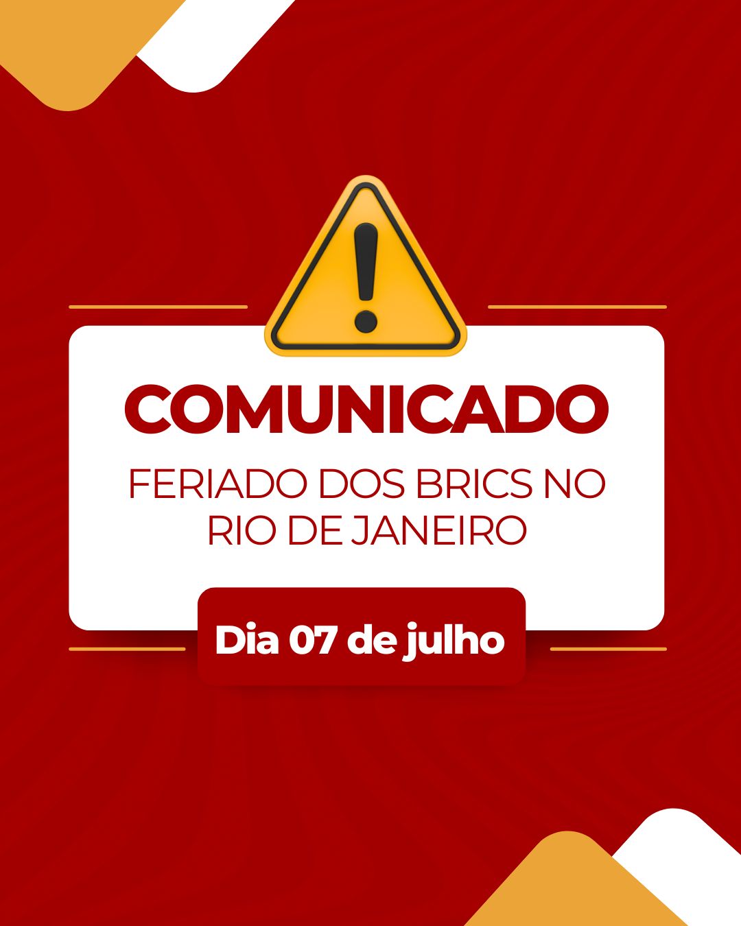 Por conta do encontro do BRICs, na cidade do Rio, ficou definido como feriado o dia 7 de julho para algumas áreas, assim como aconteceu no ano passado com a reunião do G20.